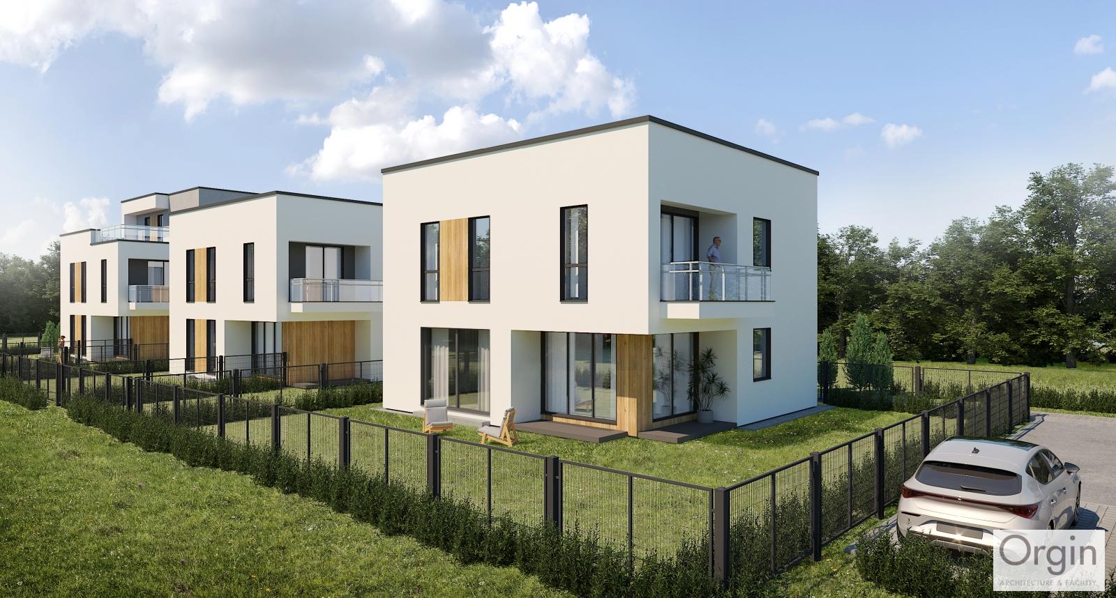 Zaprojektowano dwa typy budynków: trzy- i dwukondygnacyjne. W budynkach dwulokalowych na parterze lokal mieszkalny o powierzchni użytkowej ~53m2, lokal mieszkalny na piętrze o powierzchni użytkowej ~70m2 lub ~105m2. Każdy lokal z odrębnym ogródkiem o pow. >100m2. Dla zespołu budynków przewidziano wspólny parking od strony drogi.
